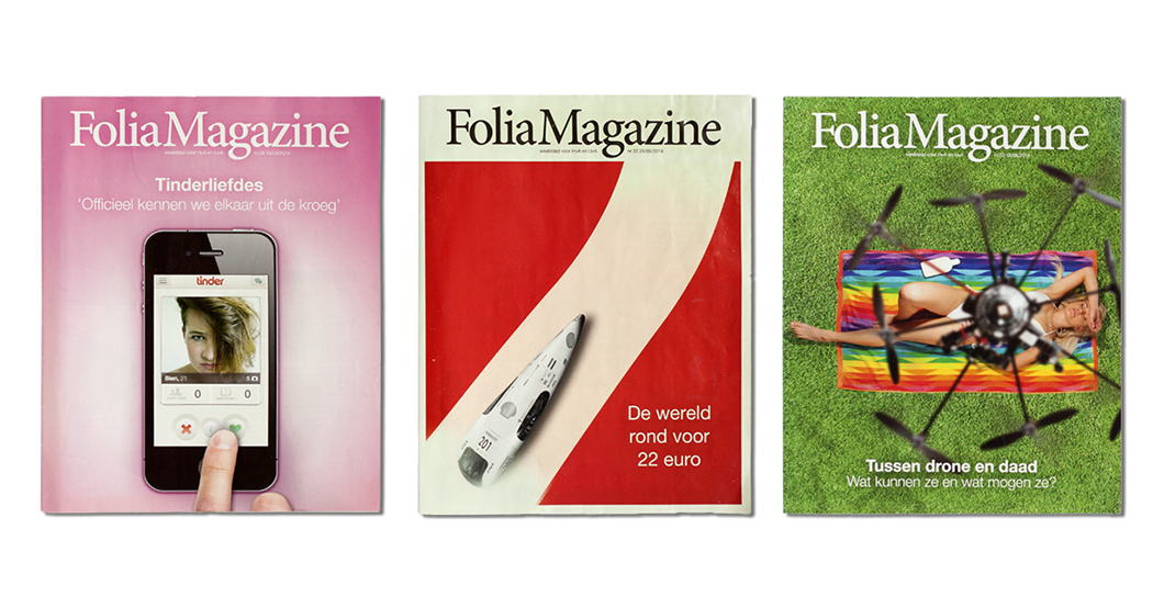 Covers Folia Magazine: Tinderliefdes, Energiezuinige auto, Drones